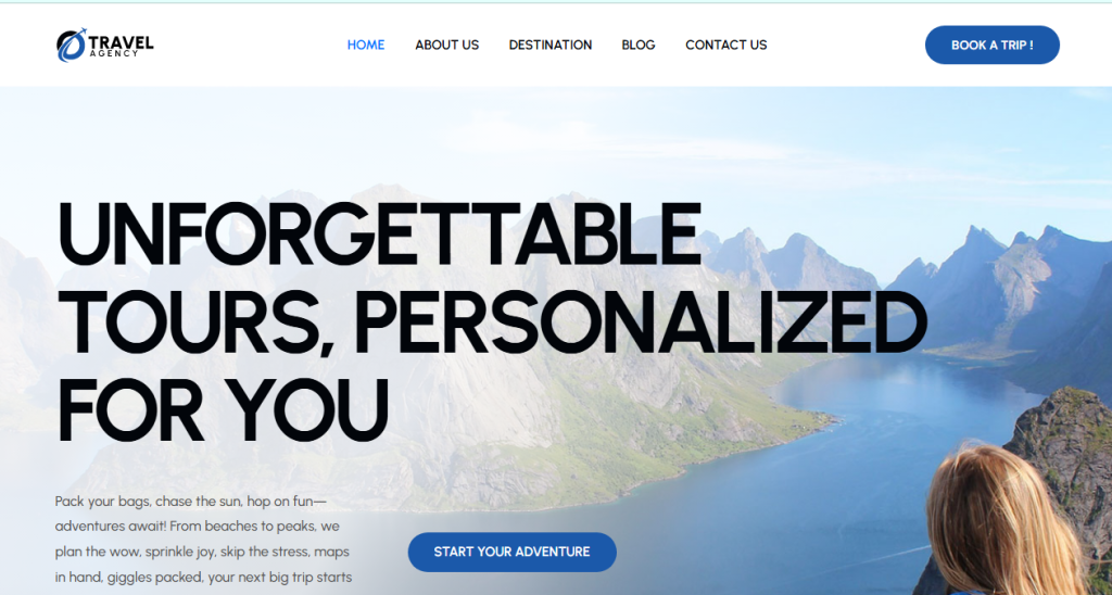 We crafted this bold and engaging landing page for a modern travel agency focused on personalized adventure tours. With large, impactful typography over a breathtaking landscape image, the design immediately captures attention and inspires exploration. The layout is clean and intuitive, with smooth navigation and clear calls to action like “Book a Trip.” We emphasized responsive design to ensure a flawless experience on both desktop and mobile, and used calming color tones to reflect the joy and ease of travel.