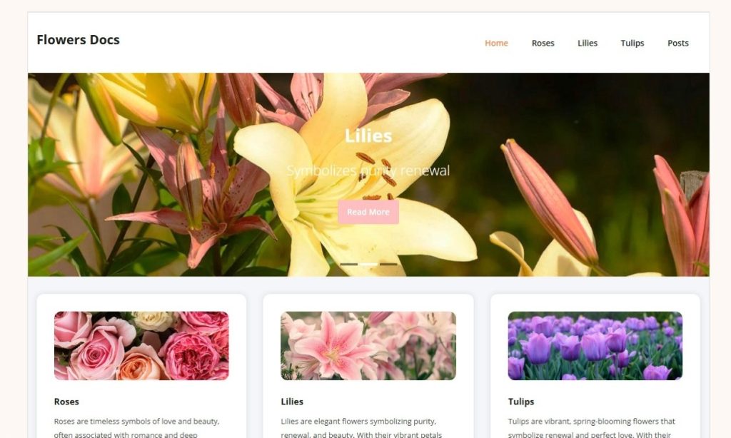 This elegant and informative website was created to showcase the beauty and characteristics of three of the most beloved flowers: lilies, tulips, and roses. Designed as a digital flower guide, the site features clean sections dedicated to each flower, enriched with vibrant images and easy-to-read descriptions. Visitors can explore facts about their symbolism, care tips, and varieties in a calm, nature-inspired layout. The design uses soft pastel colors and smooth transitions to create a peaceful browsing experience. Perfect for garden lovers, florists, or anyone interested in learning more about these classic blooms.